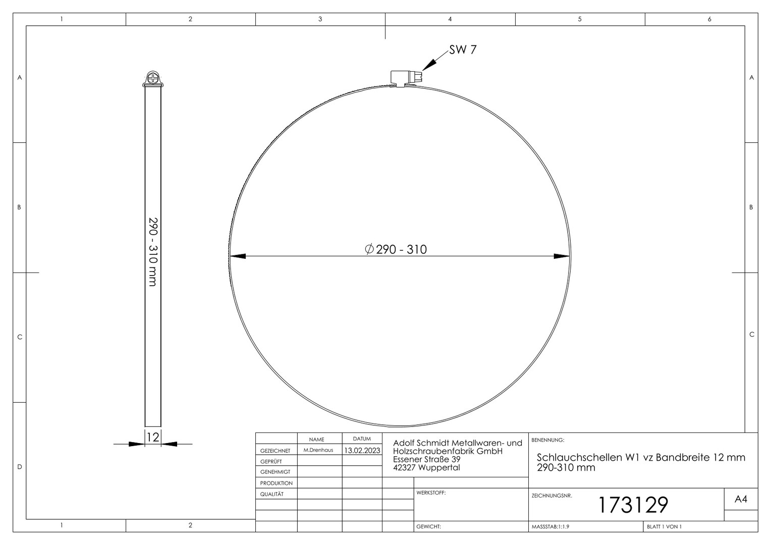 ASW Schlauchschelle W1 290-310 mm, Bandbreite 12mm, Stahl verzinkt