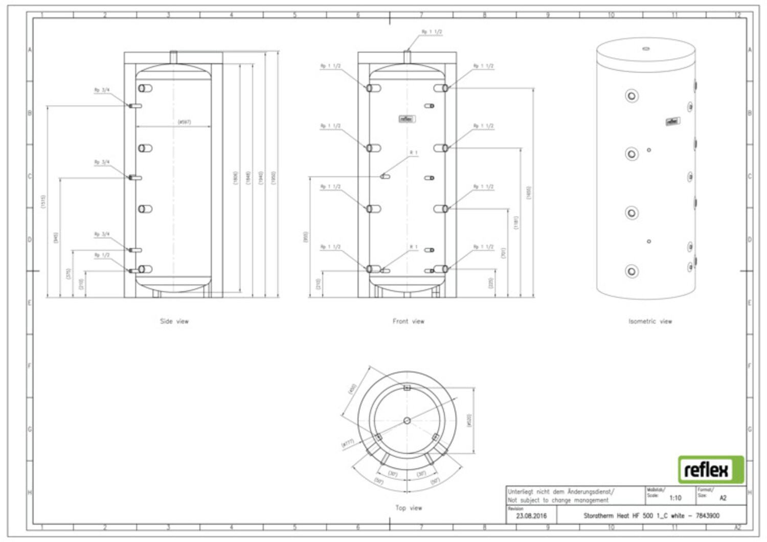 Reflex Pufferspeicher Storatherm Heat HF 500/1_C, Ø 797 mm, 3 bar, mit Isolierung und Glattrohrwärmeübertrager, weiß