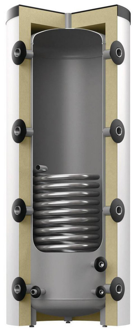 Speicher aus Stahl S235JRG2 (RSt 37-2) für Heiz- und Kühlanwendungen, zum Anschluss einer zusätzlichen Heizquelle, z. B. einer Solaranlage, Behälter innen unbehandelt und außen Kunststoff beschichtet, zulässiger Betriebsüberdruck Heizwasser 10 bar, zulässige Betriebstemperatur Behälter 95 °C, Dämmung bis 1000 l - 100 mm Vlies-Dämmung mit Folienmantel, abnehmbar, ab 1500 l - 120 mm Vlies-Dämmung mit Folienmantel, abnehmbar