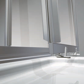 gerahmte Schiebetür, für den Einsatz in Nische, mit verkürzter Trennwand oder für Reihenduschanlagen, 3-teilig mit Schiebeelementen, für Fronteinstieg, Profile aus Aluminium, mit Einscheibensicherheitsglas nach DIN EN 12150 oder mit Polystyrolglas. bei Einscheibensicherheitsglas optional mit reinigungsfreundlicher GlasPlus-Beschichtung, geeignet für Montage auf Duschwanne und auf dem Boden, für die Einbausituation in Nische oder in Kombination mit einer verkürzten Trennwand, Breitenverstellung an zwei Seiten, an der Wand mit Wandprofil befestigt, Wandprofil mit stufenloser Breitenverstellung und zum Ausgleich von Schrägen, Breitenfixierschrauben mit Abdeckkappen, durchgehende Griffleiste, innen und außen, möglich ist Sondermaß, alleinstehend montierbar, Montagezustand vormontiert, zu kombinieren mit TwiggyTop TDTTK, bestehend aus: eine Schiebetür mit drei Schiebeelementen, zwei Wandprofile, Zubehör, Montageset, Produktdokumentation