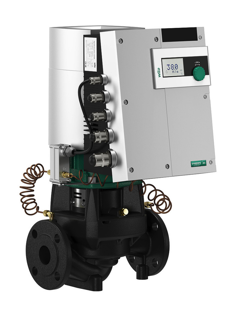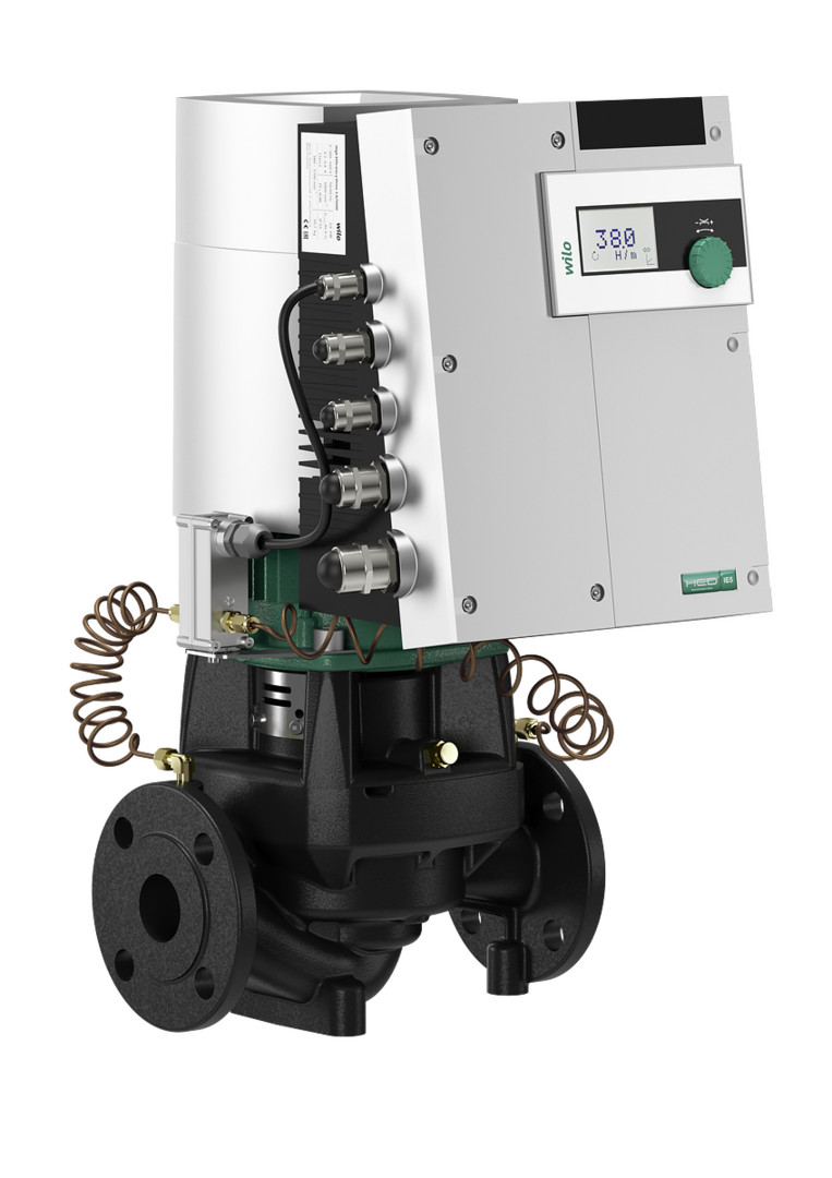 Inlinepumpe mit EC-Motor und elektronischer Leistungsanpassung in Trockenläufer-Bauart, Ausführung als einstufige Niederdruck-Kreiselpumpe mit Flanschanschluss und Gleitringdichtung, zum Einsatz für Förderung von Heizungswasser (nach VDI 2035), Kaltwasser und Wasser-Glykol-Gemischen ohne abrasive Stoffe in Heizungs-, Kaltwasser- und Kühlsystemen, optionale Schnittstellen zur Buskommunikation durch einsteckbare IF-Module