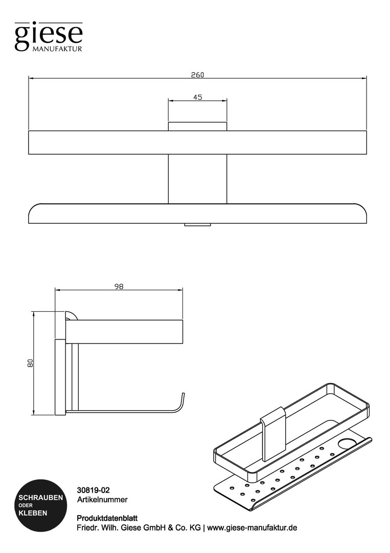 Giese Duschkorb Newport mit Halter für Rasierer, 260x96x80mm, verchromt