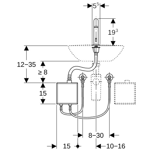 Geberit Infrarot-Waschtisch-Armatur Piave mit Thermostatmischer, Standmontage, Netzbetrieb, AP-Funktionsbox, hochglanz-verchromt W336907