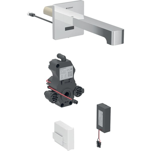 zur Entnahme von Leitungswasser, für öffentliche und halböffentliche Bereiche, zum Einbau in Montageelemente für Waschtisch, Wandarmatur mit UP-Funktionsbox, zum Anschließen von Kalt-, Warm-/Mischwasser, für den Einsatz mit Edelstahlbecken, für Beplankungsstärken von 10–50 mm, Armaturengruppe I nach DIN 4109, automatische Spülauslösung, Infrarotbenutzererkennung, IR-Sensor selbsteinstellend, vandalensicher, Volumenstrombegrenzung durch Strahlregler, Temperatureinstellung über Mischer (nur bei Ausführung mit Mischer), Wasser nicht rein warm oder rein kalt einstellbar (nur bei Ausführung mit Mischer), Stromversorgung durch Batterie, Batterie für ca. 200.000 Auslösungen ausreichend, Warnung bei schwacher Batterie, Energiesparmodus einstellbar, Wasserersparnis durch reaktionsschnelle Zweistrahl-Abtasttechnik, Funktionen mit Geberit Service-Handy einstellbar und abfragbar, Programm Wassersparen einstellbar, Programm Intervallspülung einstellbar, Dauerspülung individuell einstellbar, Spülauslösung über Clean-Handy deaktivierbar, verschiedene Funktionen manuell einstellbar, mit integriertem Rückflussverhinderer, Funktionseinheit mit eingebauten Korbfiltern, bestehend aus Waschtischarmatur, Infrarotsensor mit Anschlusskabel, Steuerelektronik, Funktionseinheit, Batteriebox, 2 Alkali-Batterien Typ AA 1,5 V, Schlüssel für Strahlregler, Befestigungsmaterial