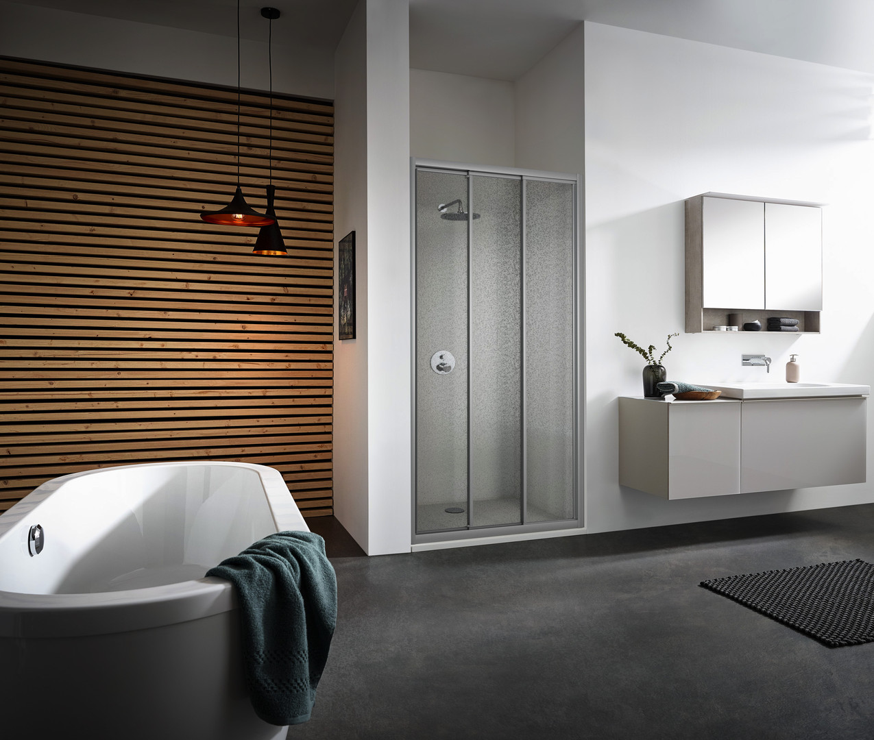 gerahmte Schiebetür, für den Einsatz in Nische, mit verkürzter Trennwand oder für Reihenduschanlagen, 3-teilig mit Schiebeelementen, für Fronteinstieg, Profile aus Aluminium, mit Einscheibensicherheitsglas nach DIN EN 12150 oder mit Polystyrolglas. bei Einscheibensicherheitsglas optional mit reinigungsfreundlicher GlasPlus-Beschichtung, geeignet für Montage auf Duschwanne und auf dem Boden, für die Einbausituation in Nische oder in Kombination mit einer verkürzten Trennwand, Breitenverstellung an zwei Seiten, an der Wand mit Wandprofil befestigt, Wandprofil mit stufenloser Breitenverstellung und zum Ausgleich von Schrägen, Breitenfixierschrauben mit Abdeckkappen, durchgehende Griffleiste, innen und außen, möglich ist Sondermaß, alleinstehend montierbar, Montagezustand vormontiert, zu kombinieren mit TwiggyTop TDTTK, bestehend aus: eine Schiebetür mit drei Schiebeelementen, zwei Wandprofile, Zubehör, Montageset, Produktdokumentation