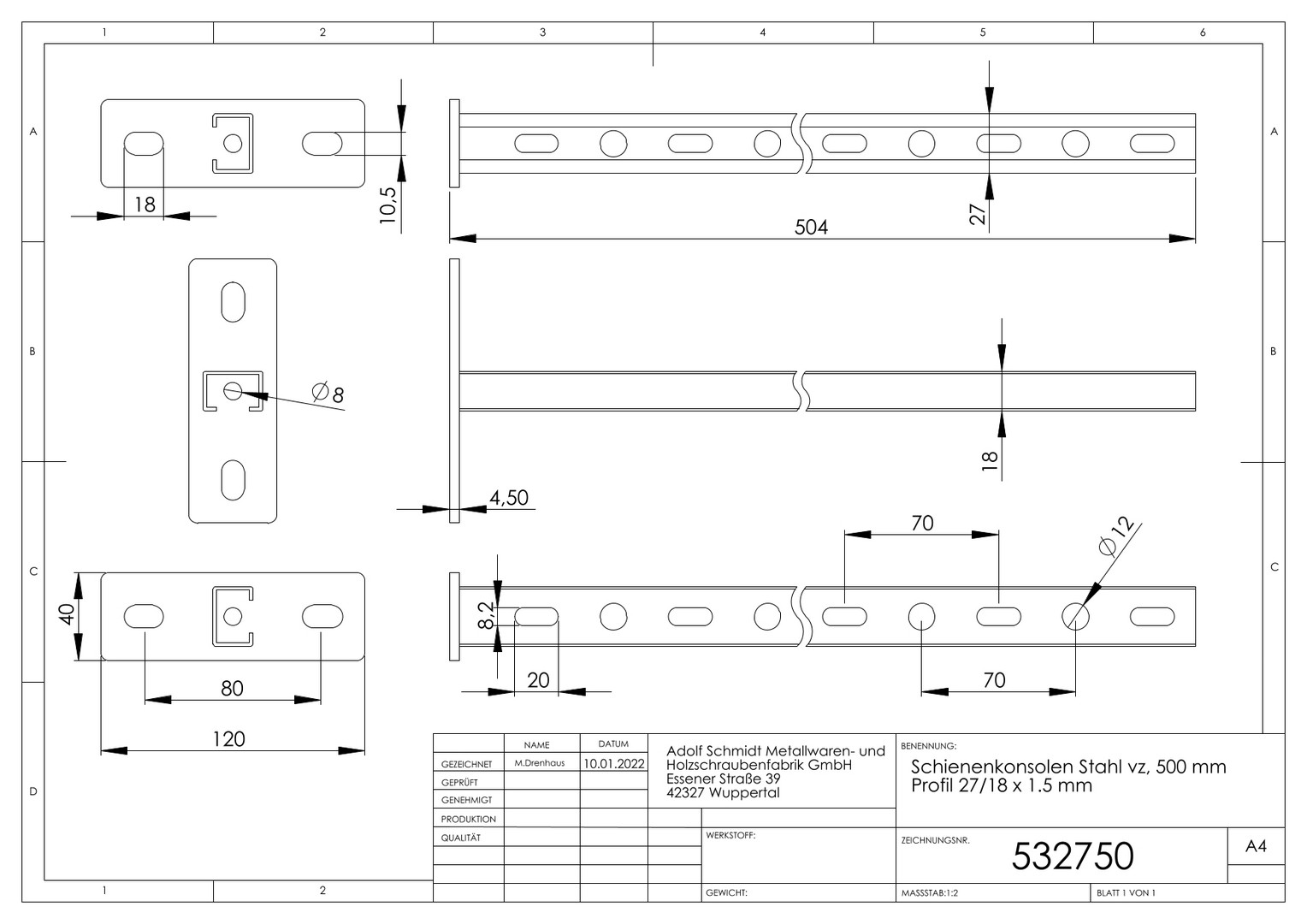 ASW Schienenkonsole 500 mm, Profil 27/18 x 1.5 mm, Stahl verzinkt