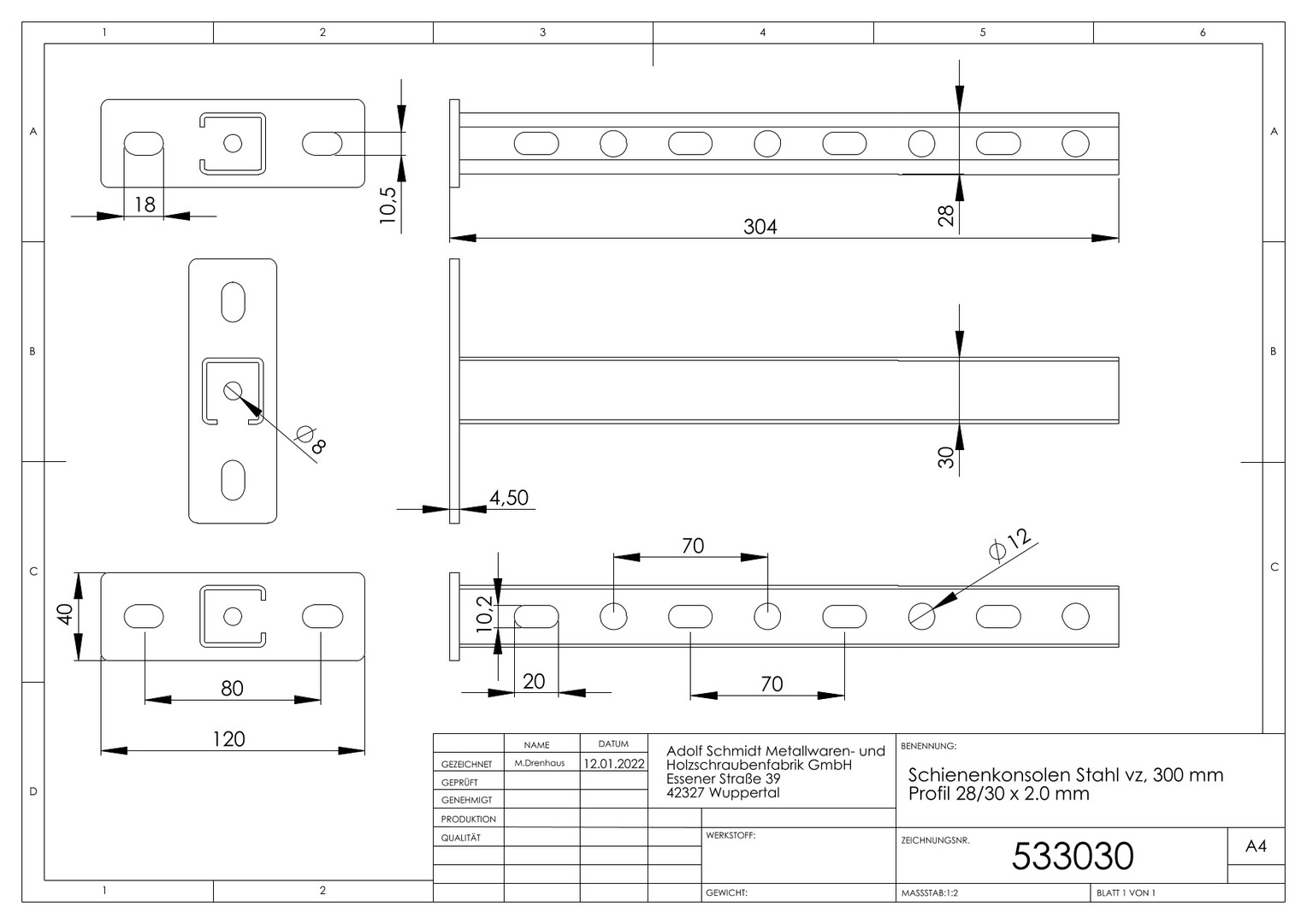 ASW Schienenkonsole 300 mm, Profil 28/30 x 2.0 mm, Stahl verzinkt