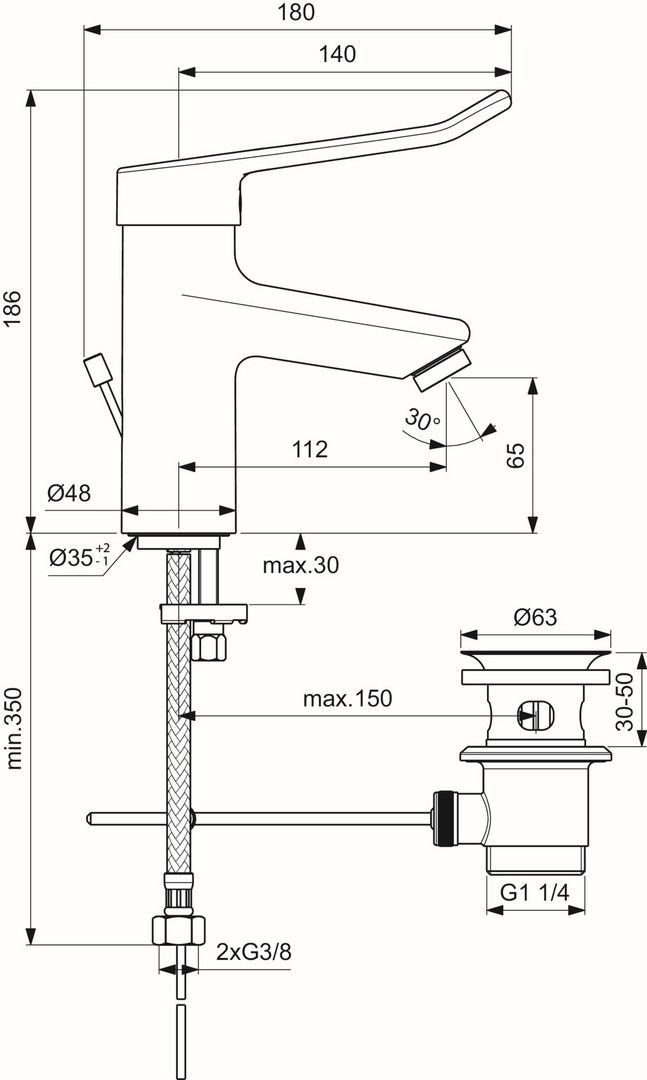 Ausladung 112 mm, Auslaufhöhe 65 mm, vandalensicherer Strahlbrecher (aerosolarm) (sichtbar), Metall-Zugstangen-Ablaufgarnitur G 1 1/4, flexible Anschlussschläuche G 3/8, Griff aus Metall mit Rot-/Blau-Markierung, Schnellmontagesystem, Kartusche Ø 38 mm, Kartusche mit keramischen Dichtscheiben, Kartuschenschwenkbereich 100°, Kartuschenübersetzung aus Edelstahl, Heißwassertemperaturbegrenzer, Norm DIN EN 248, Geräuschverhalten DIN 4109 Gruppe 1, Lebensdauer DIN EN 817, DIN EN 200