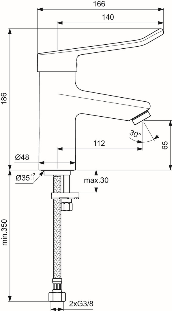 Ausladung 112 mm, Auslaufhöhe 65 mm, vandalensicherer Strahlbrecher (aerosolarm) (sichtbar), Metall-Zugstangen-Ablaufgarnitur G 1 1/4, flexible Anschlussschläuche G 3/8, Griff aus Metall mit Rot-/Blau-Markierung, Schnellmontagesystem, Kartusche Ø 38 mm, Kartusche mit keramischen Dichtscheiben, Kartuschenschwenkbereich 100°, Kartuschenübersetzung aus Edelstahl, Heißwassertemperaturbegrenzer, Norm DIN EN 248, Geräuschverhalten DIN 4109 Gruppe 1, Lebensdauer DIN EN 817, DIN EN 200