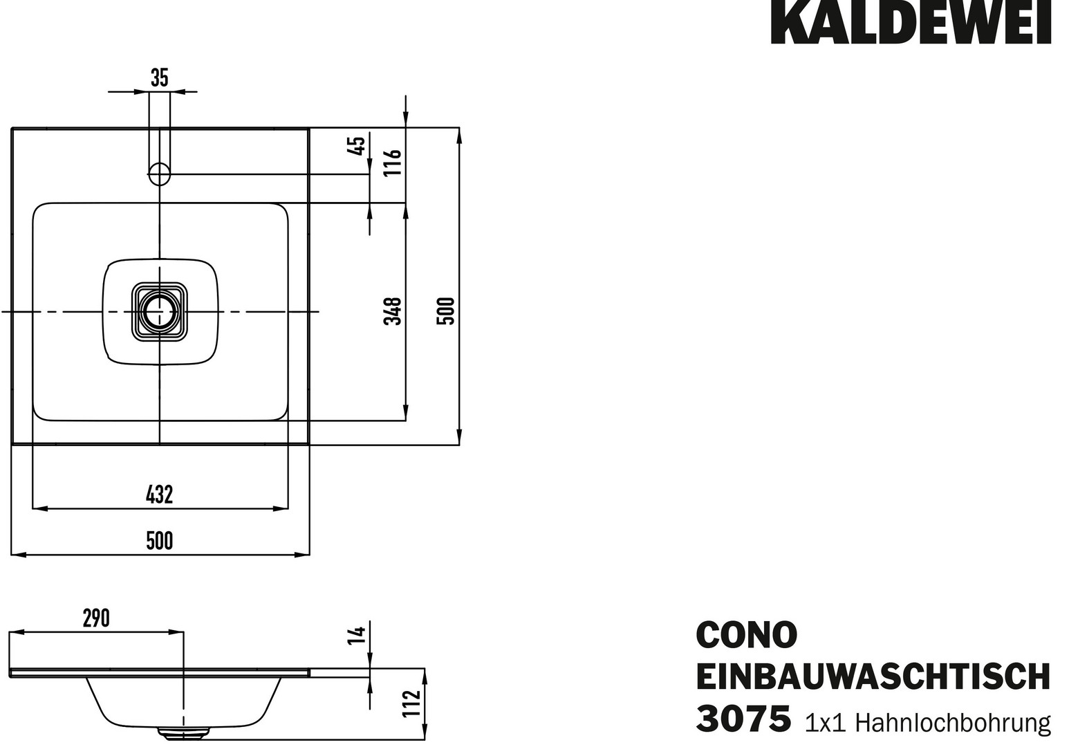 Kaldewei Einbau-Waschtisch CONO 3075 50x50cm, 1 Hahnloch, chrom, Perl-Effekt, alpinweiß W44077