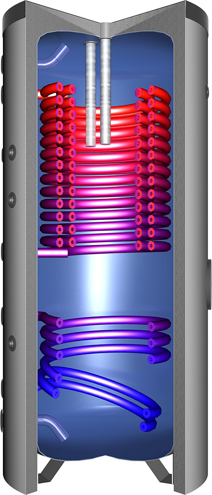speziel für die Kombination Wärmepumpe/Solar, oben doppelt gewickelte Glattrohrwärmetauscher, unten einfach gewickelte Glattrohrwärmetauscher, 180 mm Flansch unten, Betriebsdruck 10 bar, Wärmetauscher 10 bar, silber, Thermometer, 2 Stück Magnesiumanode 5/4"