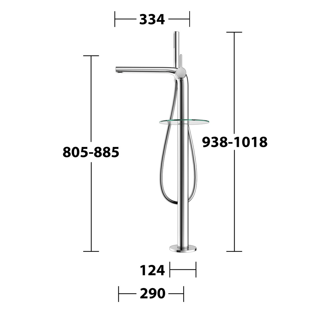 Auslaufhöhe 737-817 mm, Anschlussart Grundkörper G 1/2, Schlauchanschluss G 1/2, Brausehalter für Schläuche mit konischer Mutter, Handbrause mit 1 Strahlart (Normalstrahl), Brauseschlauch 1250 mm, Ablage schwenkbar, Mischwasserkartusche mit keramischen Dichtscheiben, mit Temperaturbegrenzung, Umstellventil mit keramischen Dichtscheiben, Strahlregler M 24 x 1, Durchflussmenge 20 l/min, Durchflussmenge Handbrause begrenzt auf 12 l/min, eigensicher gegen Rückfließen nach DIN EN 1717, für Durchlauferhitzer geeignet