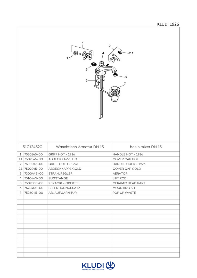 KLUDI 1926 Waschtisch-Zweigriff-Armatur Kreuzgriffe, mit Ablaufgarnitur, Ausladung 125mm, chrom W324717
