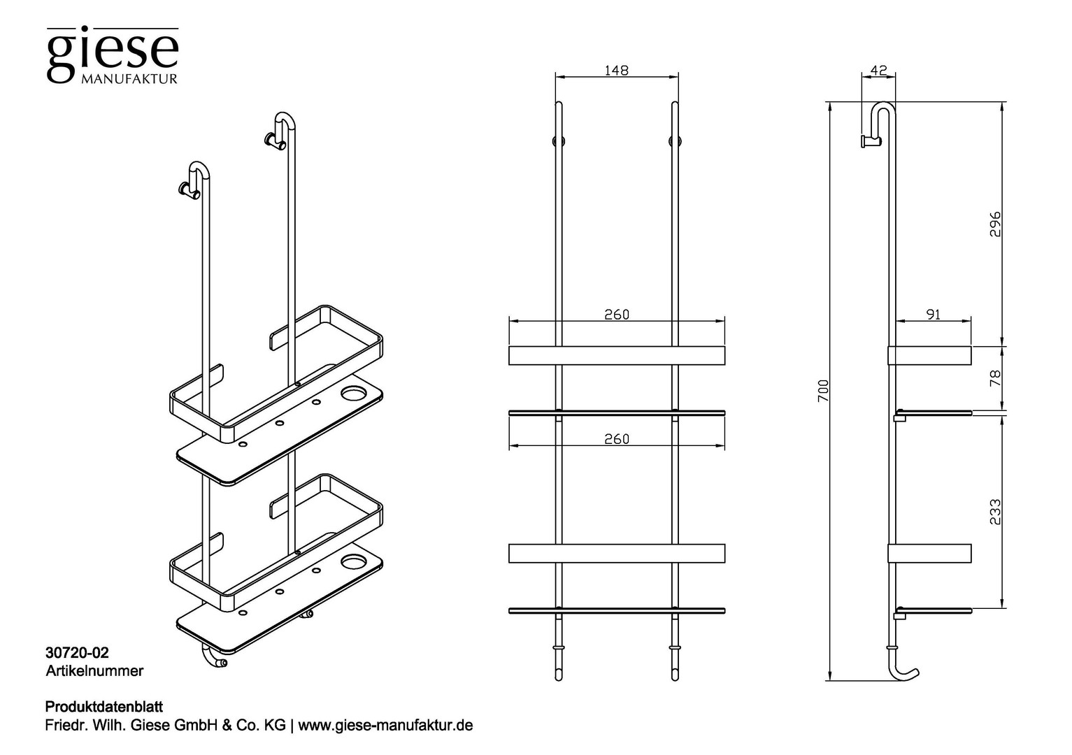 Giese Duschkorb Bodyguard Newport 260x700x42mm, für Glaswand 6/8mm, mit Halter für Rasierer, verchromt
