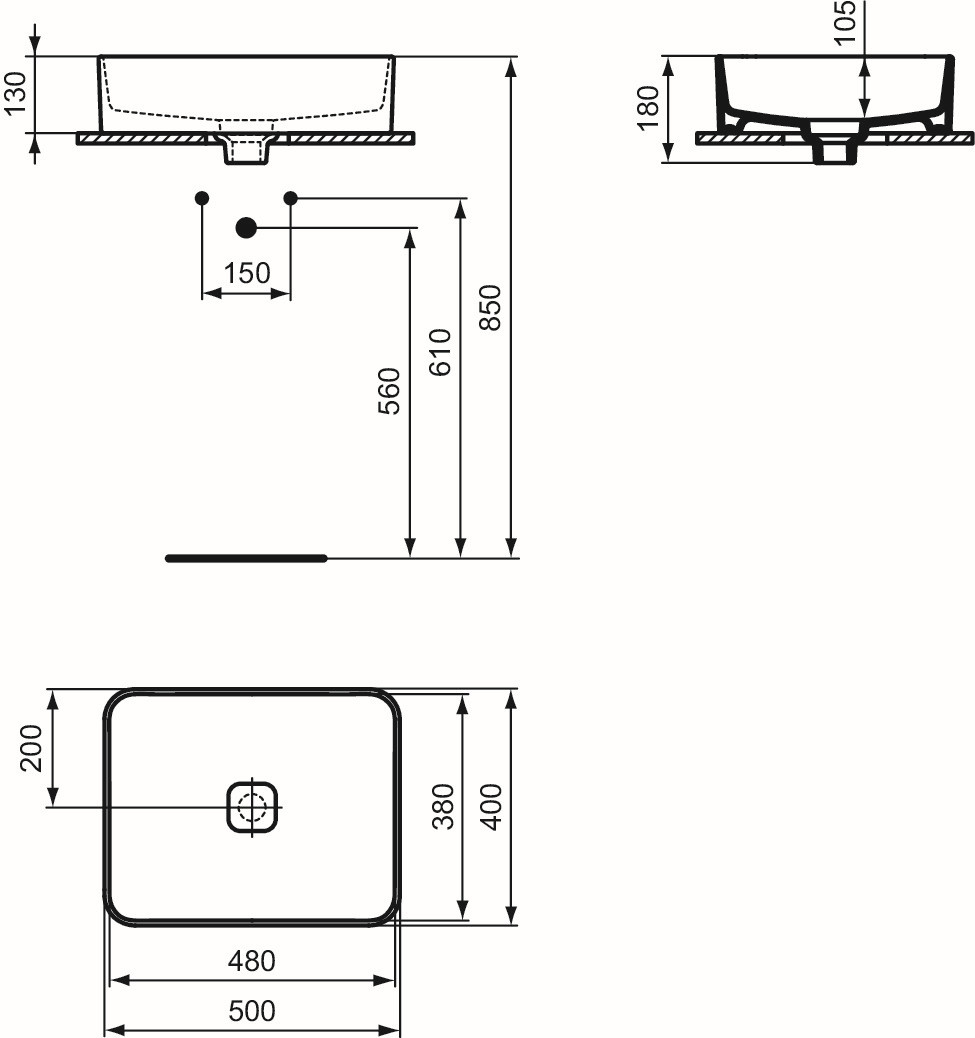 Ideal-Standard Aufsatzwaschtisch Strada II 50x40x18cm, ohne Hahnloch/Überlauf, weiß