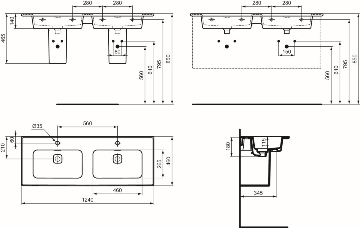 Ideal-Standard Möbeldoppelwaschtisch Strada II 124x18x46cm, ohne Hahnloch, mit Überlauf, weiß W35487