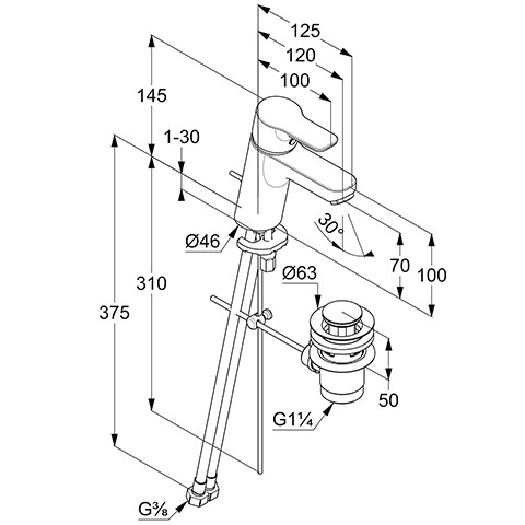 Einlochmontage, geschlossener Hebel, Keramik-Kartusche mit Heißwasserbegrenzung, Strahlregler M 24 x 1, Durchflussmenge 5 l/min bei 3 bar, Ablaufgarnitur G 1 1/4 aus Metall, flexible Anschlüsse G 3/8, Schnell-Montagesystem, Auslaufhöhe Unterkante 70 mm