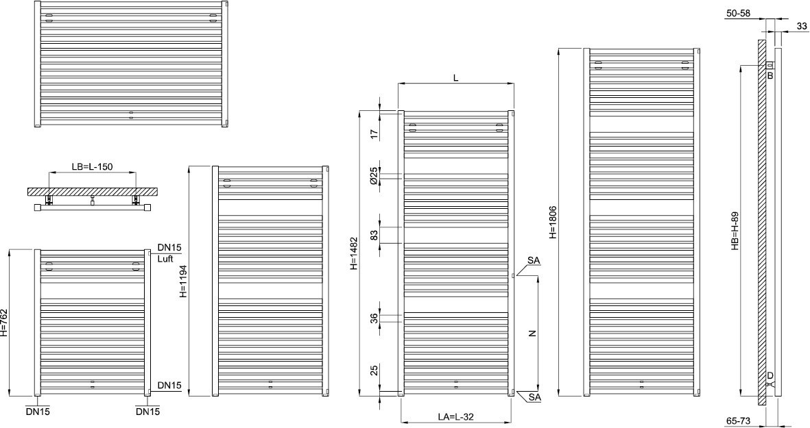 für Zentralheizung (zusätzliche Ausstattung mit Elektroheizstab) und für die Erwärmung von Handtüchern und Textilien, horizontale Rundrohre 25 mm mit vertikalen Quadratrohren 30 x 30/32 x 33 mm verbunden, Quadratrohre mit gerundeten Kanten und rundum glatter Oberfläche, wendbar bei der Montage, ideal als Raumteiler, mit 1-3 Aufnahmeöffnungen für Handtücher (Bauhöhe 654 mm ohne Öffnung), die seitlichen Anschlüsse sind werkseitig mit 1 Spezial-Blindstopfen und 1 Entlüftungsstopfen DN 15 wasserdicht verschlossen, Oberfläche pulverbeschichtet DIN 55900 und bei ca. 180 °C eingebrannt, serienmäßiges Zubehör: 2 Befestigungen aus Aluminium-Druckguss, tiefenverstellbar erfüllen AK 1-3 nach VDI 6036, mit 2 Sechskant-Holzschrauben, 2 Dübel sowie Klemmhalter mit Distanzschraube, Wärmeleistungen nach DIN EN 442-2, Heizmedium Wasser, max. zul. Betriebstemperatur: 100 °C, max. zul. Betriebsüberdruck 10 bar