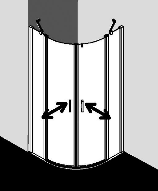 teilgerahmt, Viertelkreis-Duschkabine mit zwei Glasflügeln-nach innen und außen öffnend, mit zwei Festfeldern und zwei Stabilisierungen (innen), Verglasung der Festfelder mit 5 mm, Pendeltüren mit 4 mm Einscheiben-Sicherheitsglas, Profile aus Aluminium, Griffe und Gelenke aus Metall, Verstellmöglichkeit je Wandprofil 25 mm, Profilgelenk mit Hebe-Senk-Mechanismus, durchgehende Magnetleisten und Dichtprofile, waagerechte Dichtleiste in mit 6 mm Bodenschwelle oder ohne Bodenschwelle (bodenfrei) installierbar, mit Befestigungsmaterial und transparentem Handtuchhalter-Haken, die waagerechte Schräge darf max. 5 mm betragen