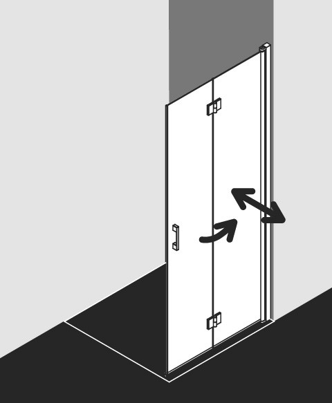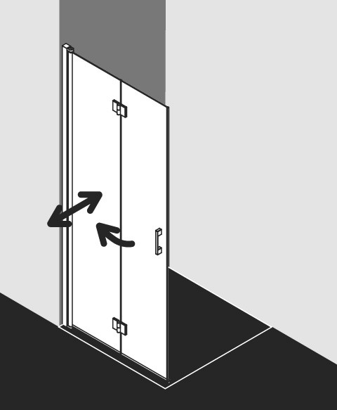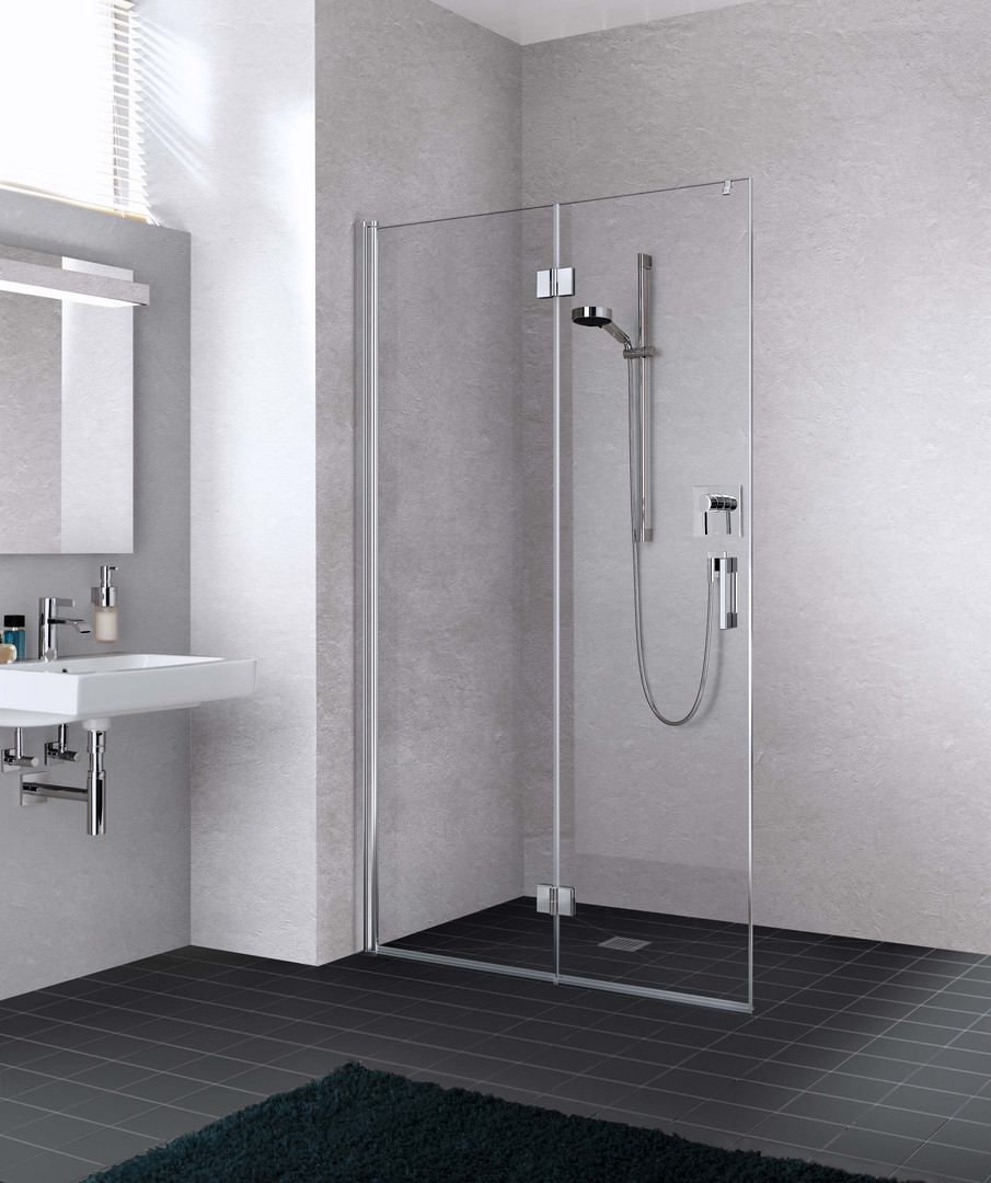 teilgerahmte Faltwand mit zwei Glasflügeln, im Wandgelenkprofil 90° nach innen und außen schwenkbar, im Beschlagsgelenk 180° nach außen schwenkbar, Verglasung mit 5 mm Einscheiben-Sicherheitsglas nach DIN EN 12150, Profile aus eloxiertem Aluminium, Griffe und Gelenke aus Metall, Verstellmöglichkeit im Wandgelenkprofil 25 mm, Profilgelenk mit Hebe-Senk-Mechanismus, Beschlagsgelenk mit Hebe-Senk-Mechanismus, durchgehende Dichtprofile, waagerechte Dichtleiste mit Wasserabpralleffekt, mit Glaskantenschutzprofil, Befestigungsmaterial, frei platzierbarer transparenter Handtuchhalter-Haken