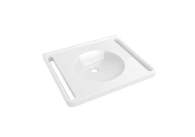 mit Ablagefläche und tiefem rundem Becken, ohne Überlauf, mit Schwallkante zur Wand, mit porenfreier Oberfläche, integrierte ergonomische Haltemöglichkeit, als Handtuchhalter nutzbar, unterfahrbar nach DIN 18040 und ÖNORM B 1600/1601, belastbar nach DIN EN 14688, für Stockschraubenbefestigung