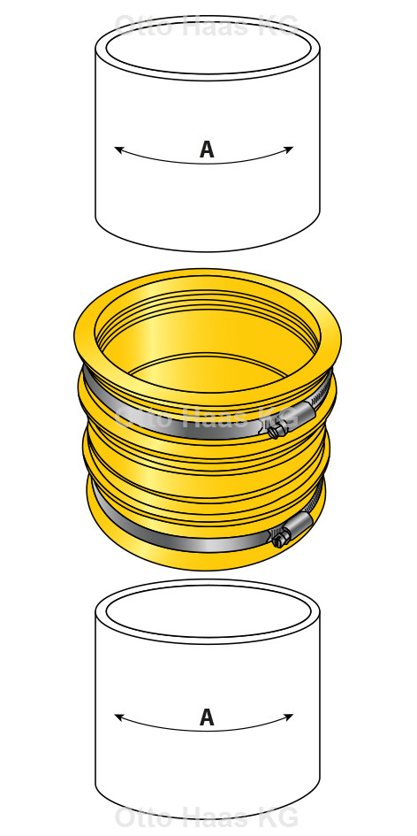 außenliegend, zur Verbindung zweier Abwasserrohre mit den gleichen Rohrdimensionen, zur Kombination von verschiedenen Werkstoffen, für waagerechten bzw. senkrechten Einbau, Unterputz geeignet, druckdicht 0,5 bar, passend für Faserzement-/Eternitrohr/Geberit PE/Geberit Silent-db 20/Geberit Silent-PP/Gusseisenrohr GGG duktil/HT-Rohr/KG-Rohr/LNA Gusseisenrohr/LORO-X/POLO-KAL NG/Skolan db/SML/MLB /Steinzeugrohr Harsch und Wavin AS, EPDM alterungs- und witterungsbeständig nach DIN EN 681-1, mit Schlauchklemmen W2, Band und Gehäuse aus nichtrostendem Chromstahl 1.4016 X6Cr17 nach DIN 3017-1, SW 7, Außensechskantschraube W1