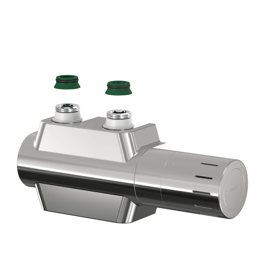 Anschluss rechts/links umbaubar, Set bestehend aus: 1x absperrbare Anschlussarmatur mit voreinstellbarem Ventileinsatz für Handtuch- und Designheizkörper, für Einrohr- und Zweirohrsysteme nutzbar, Heizkörperanteil 30-100 % (werksseitig eingestellt auf 35 %), Bypass zur stufenlosen Einstellung bei Einrohrbetrieb, Anschlussgewinde zum Thermostatkopf M 30 x 1,5, kombiniert Eck- und Durchgangsform, Thermostat umbaubar für rechts- oder linksseitigen Anschluss, integriertes Füll- und Entleerventil für Schlauchverschraubungen, mit selbstdichtenden Anschlussnippeln und Konusteilen für Handtuch- und Designheizkörper mit Rp 1/2 oder G 3/4 M (Eurokonus) Hahnblock-Anschluss, rohrseitig mit Eurokonus für den Anschluss mit Klemmverschraubungen, Achsabstand 50 mm, mit Einstellschlüssel, 1x Designverkleidung aus Kunststoff in Hochglanz-Optik, 1x Design-Thermostatkopf mit eingebautem Flüssigkeitsfühler, Gewindeanschluss M 30 x 1,5, Sollwertbereich: 7-28 °C, mit Nullstellung und Frostschutzfunktion, nicht steigend, 4 Anschlussmöglichkeiten, Bauteile aus Messing vernickelt und Kunststoff, Dichtmaterialien aus EPDM, max. Betriebstemperatur: 110 °C Dauertemperatur/130 °C kurzzeitig, max. Betriebsdruck 10 bar