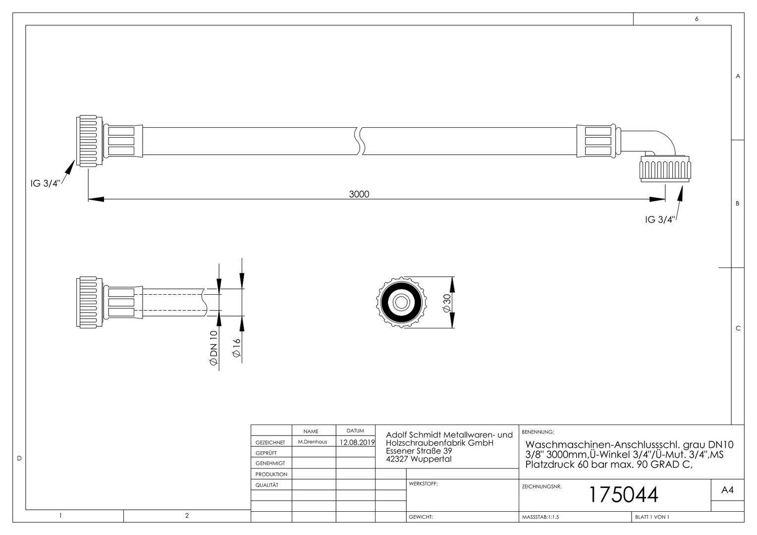 ASW Wasch-/Spülmaschinen-Zulaufschlauch 3000 mm, DN 10, 3/8", grau, heißwasserbeständig
