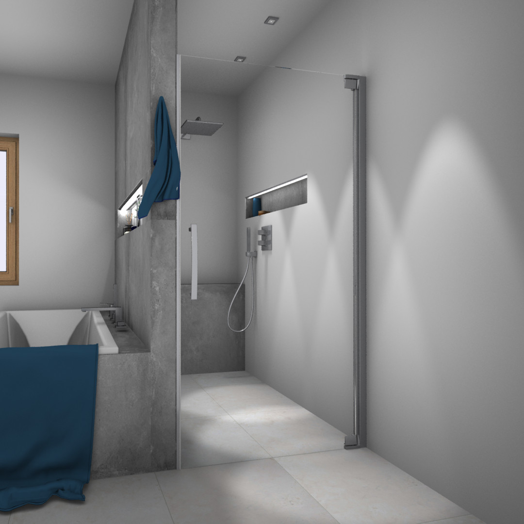 Glas 8 mm ESG, Standardhöhe 200 cm, Tür öffnet nach Innen und Außen, alternativ mit 4 mm oder 15 mm hoher Schwallschiene, PALM.free, PALM.fix, PALM.lift, PALM.isi-clean, optional: PALM.nano, PALM.care, PALM.magic, durchgehendes Wandbefestigungsprofil mit Verstellbereich