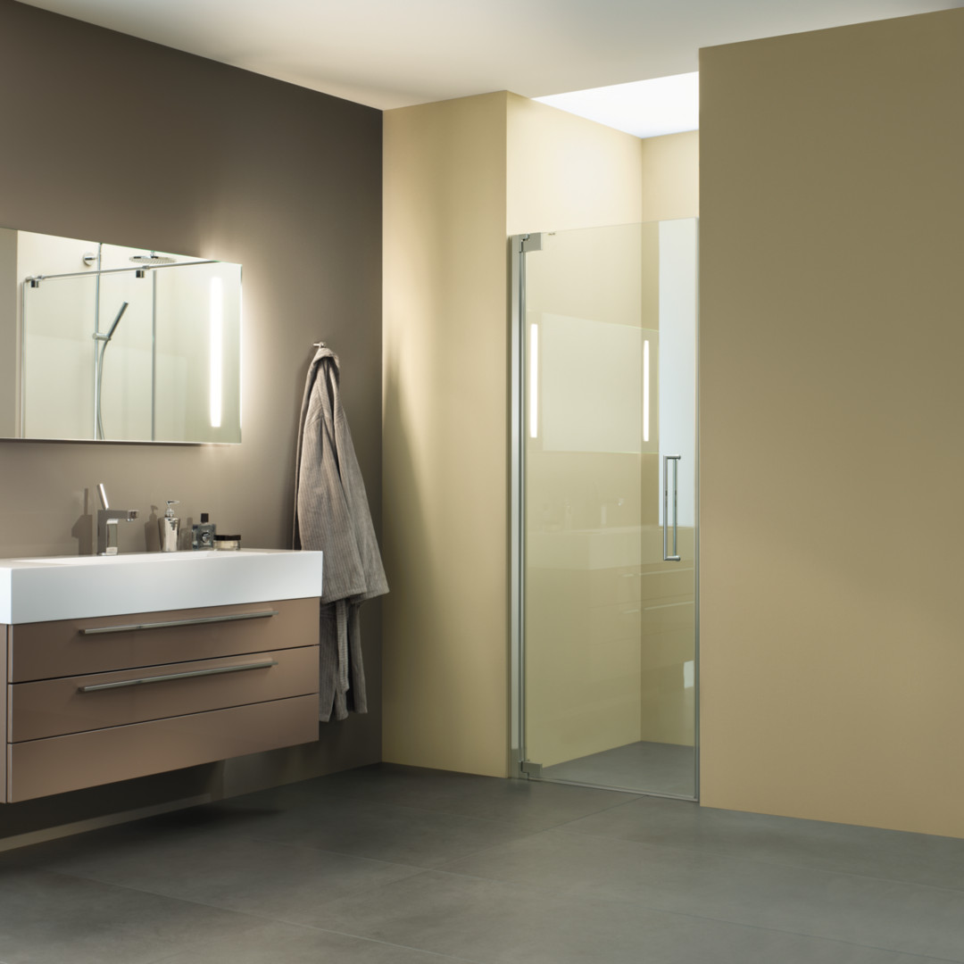 Glas 8 mm ESG, Standardhöhe 200 cm, Tür öffnet nach Innen und Außen, bodeneben, ohne Schwallschiene, PALM.fix, PALM.lift, PALM.free, PALM.isi-clean, optional PALM.nano, PALM.care, durchgehendes Wandbefestigungsprofil mit Verstellbereich