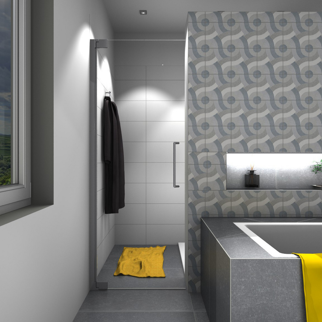 Glas 8 mm ESG, Standardhöhe 200 cm, Tür öffnet nach Innen und Außen, bodeneben, ohne Schwallschiene, PALM.fix, PALM.lift, PALM.free, PALM.isi-clean, optional PALM.nano, PALM.care, durchgehendes Wandbefestigungsprofil mit Verstellbereich