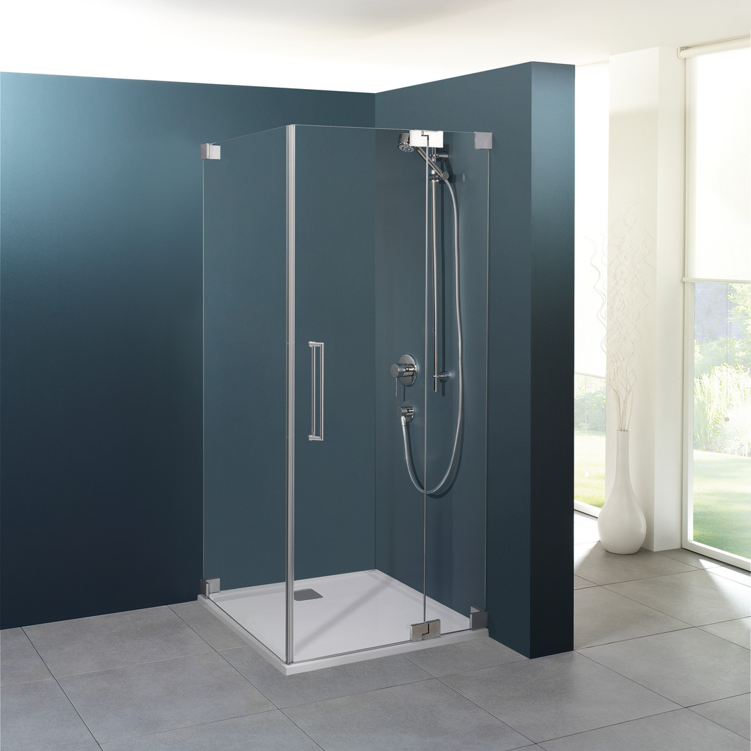 Glas 8 mm ESG, Standardhöhe 200 cm plus 3 cm Rundrohrbügel Ø 1,4 cm, Tür öffnet nach Innen und Außen, bodeneben, ohne Schwallschiene, PALM.fix, PALM.lift, PALM.free, PALM.pro, PALM.isi-clean, optional: PALM.nano, PALM.care, punktuelle Wandbefestigung mittels Beschlägen, kostenlose Naturmaßabnahme erforderlich