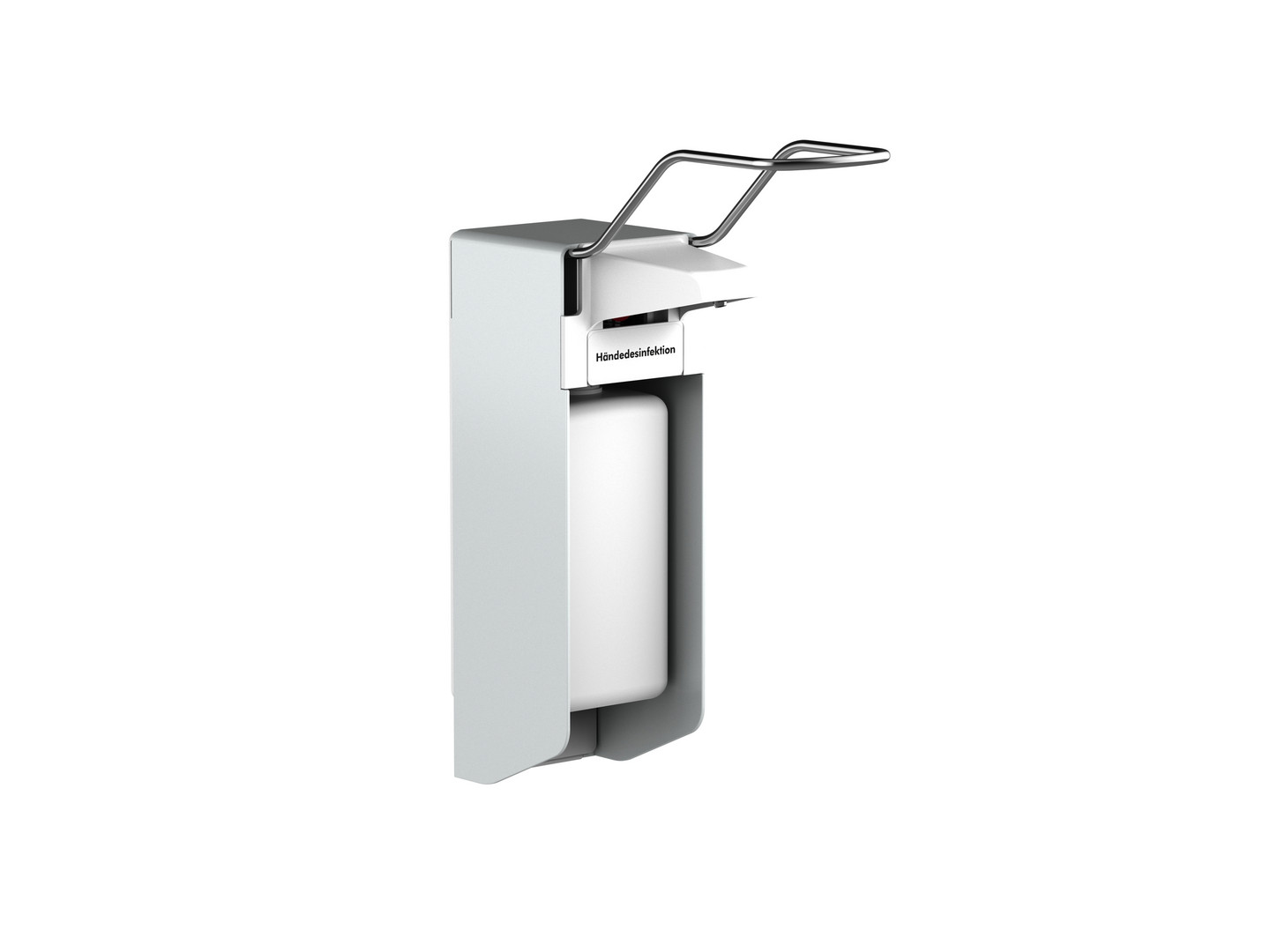 (H x B x T) 252 x 80 x 85 mm, für marktübliche 500 ml Standardflaschen zur Verwendung von alkoholischen Desinfektionsmitteln, flüssiger Seife oder fließfähiger Pflegelotion, mit nach vorn herausnehmbarer Kunststoffpumpe als hygienische Lösung der Einwegverwendung, nach oben verschiebbare Auslaufblende ermöglicht einen Pumpenwechsel ohne den Spender von der Wand zu nehmen, Dosierung einstellbar (max.-min.), Gehäuse aus mattsilber eloxiertem Aluminium, mit langem Edelstahlbedienhebel, autoklavierbar bis 121 °C, 1 bar und spülmaschinengeeignet, Wandhalter aus Kunststoff, Spender in Einzelverpackung mit Montageanleitung, Befestigungsmaterial, Zubehörbeutel und je ein auswechselbarer Clip mit der Aufschrift „Seifencreme“ bzw. „Händedesinfektion“