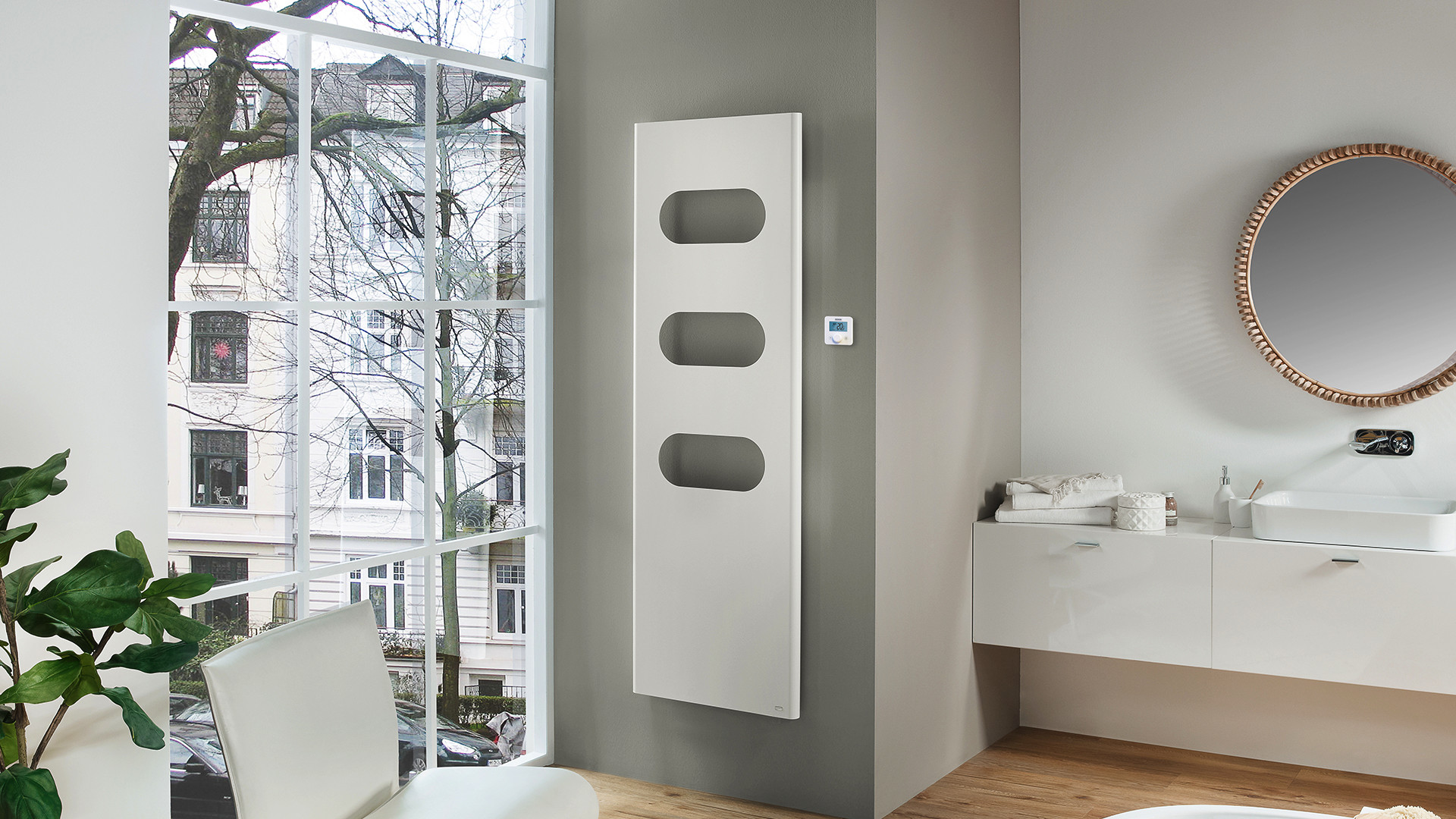 für den Zentralheizungsbetrieb (zusätzliche Ausstattung mit Elektroheizstab) mit planer Front, 3 Öffnungen im Einklang mit den halbrunden Seitenlinien zur Handtuchablage und seitlichen Schatten (Licht)fugen, Grundkörper ohne Konvektionslamellen in geschweißter Ausführung aus vertikalen Rundrohren 35 mm und horizontal angeordneten Flachprofilrohren 50 x 10 mm, pulverbeschichtet, die halbrunden, softigen Seiten enden im 60° Winkel nach innen und lassen eine Fuge zur Wand für Schatten oder Licht frei, die Seiten haben einen verdeckten Falz zur Aufnahme der optional lieferbaren LED-Hinterleuchtung, plane Front verblendet die komplette Ventilgarnitur für Mittenanschluss DN 15 (1/2“) x 50 mm, der Bedienknauf des optionalen Thermostaten ist sichtbar, Anschlussgarnitur bestehend aus Ventil mit Verschraubung DN 15 (1/2") und absperrbaren Eckverschraubungen DN 15 (1/2") mit AG DN 20 (3/4") Eurokonus für Rohranschluss mittels Klemmringverschraubung, flexiblen Anschlussleitungen, 1 Doppelnippel DN 15 (1/2"), 1 Entlüftungsventil DN 15 (1/2"),1 Wandträger oben und 1 Abhebesicherung unten, mit Schrauben und Dübeln