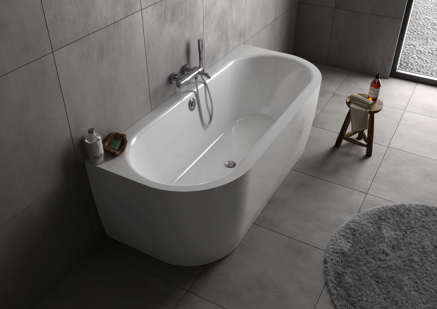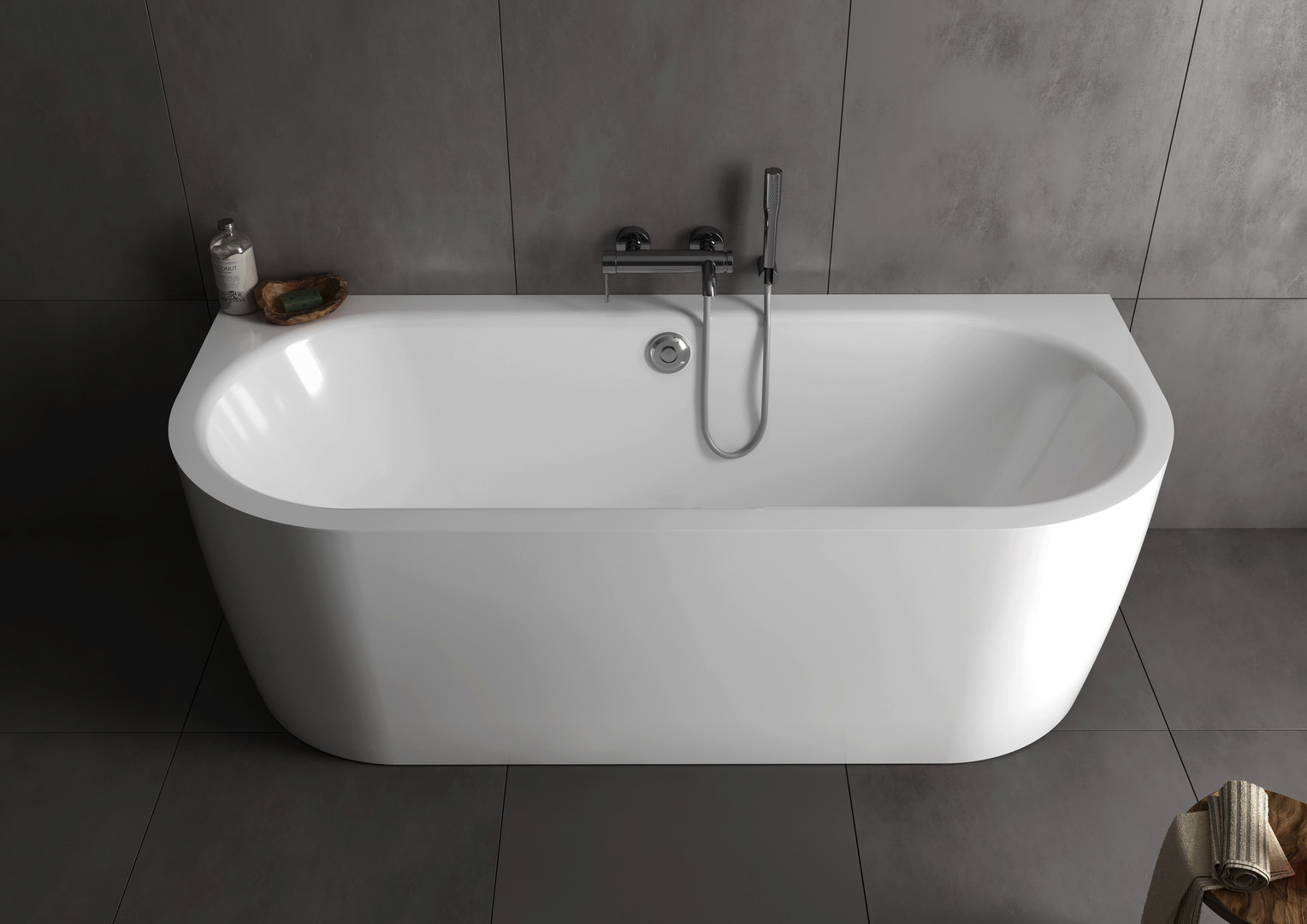 wandstehende Badewanne, mit angeformter Schürze, gegossenes Sanitäracryl, mit Bodenbrettern aus Holz verstärkt, mit vormontierter Ablauf-/Überlaufgarnitur, mit integriertem verstellbaren Fußgestell, mit fest montierter Schürze, ovale Innenfläche, nahtloser Übergang zwischen Wannenrand und Schürze, Rutschfest und angenehm hautsympatisch, hygienisch, UV-beständig, bruchfest, Oberfläche aus durchgefärbtem Sanitäracryl, kleine Schäden können ausgebessert werden, geringe elektrische Leitfähigkeit, Wannentiefe von 480 mm für entpanntes Baden, geringes Eigengewicht