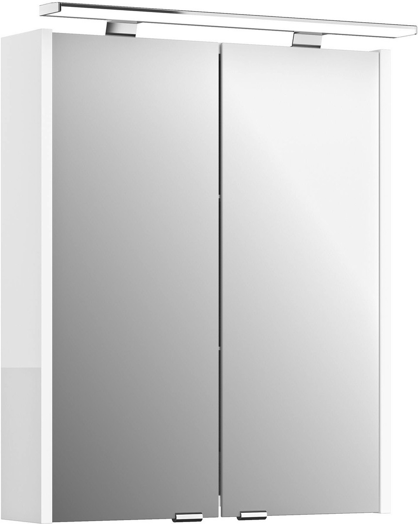 LED-Aufsatzleuchte B: 610 mm, 12 Volt/8 W, 325 LM, 6000 K, IP44, 2 doppelt verspiegelte Türen (5 mm) mit Anschlagdämpfung, 2 Glaseinlegeböden (5 mm) mit Kippsicherung mit Schalter-/ Steckdosenmodul, Trafobox in silber Korpusstärke: Seiten: 18 mm, Rest: 16 mm, Korpusfarbe: Weiß Glanz, Griff: chrom Glanz