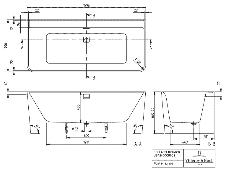 V&B Rechteck-Badewanne VN Collaro 179x79x62cm, Vorwand, Acryl, weiß W214097