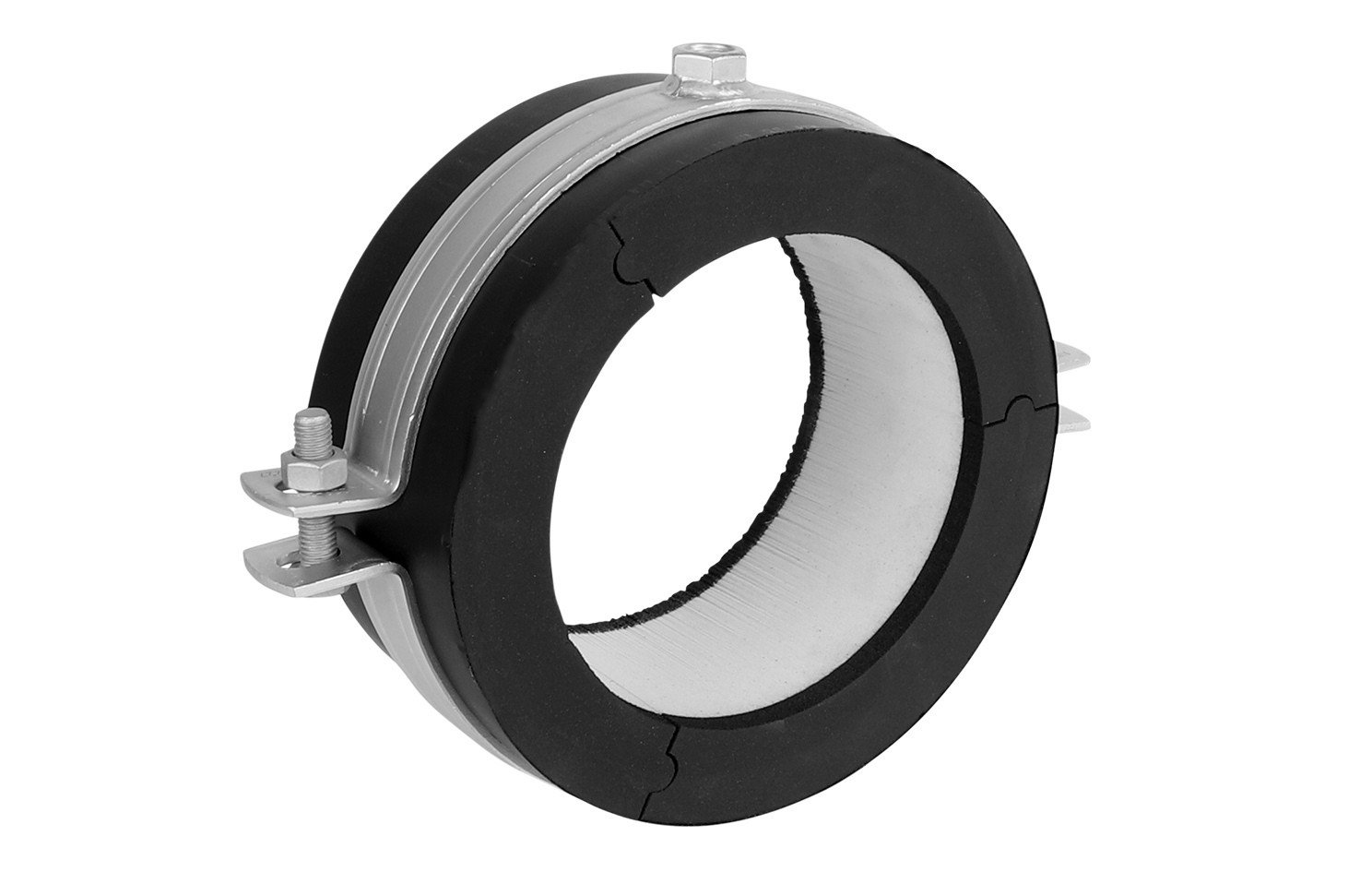 Schelle mit Sicherheitsverschluss, zur Befestigung von thermischen isolierten Rohren aus Stahl, Kupfer oder Edelstahl, dampfdicht verklebbar mit Rohrisolierung, Stoßflächen der Isolierschale bei Montage waagerecht ausrichten und verkleben (um Zug- und Druckkräfte zu verhindern), mit selbstklebender PVC-Überlappung zum leichten Verschluss des Rohrträgers, Oberflächenbeschichtung Ultra Protect 1000 Systemtechnologie, ein System für Installation im Innen- und Außenbereich, besteht min. 1000 Std. Salzsprühtest nach DIN ISO 9227, Gebrauchstemperatur -45 °C bis +105 °C, Isolierschale aus Elastomerkautschuk, mit PIR-Kern und Dampfsperre ummantelt