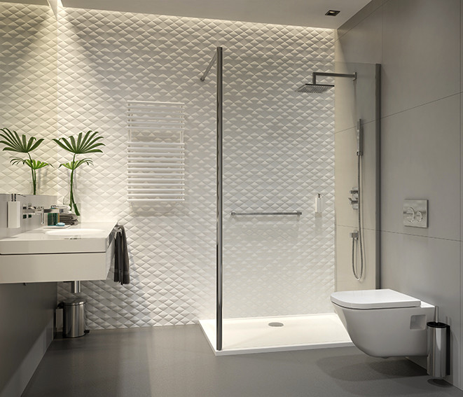 ESG klar mit EverClean, Glasstärke 6 mm, mit Motivdruck, Verstellbereich Wandanschlussprofil +/- 10 mm, Haltestange kann vor Ort auf die gewünschte Länge gekürzt werden