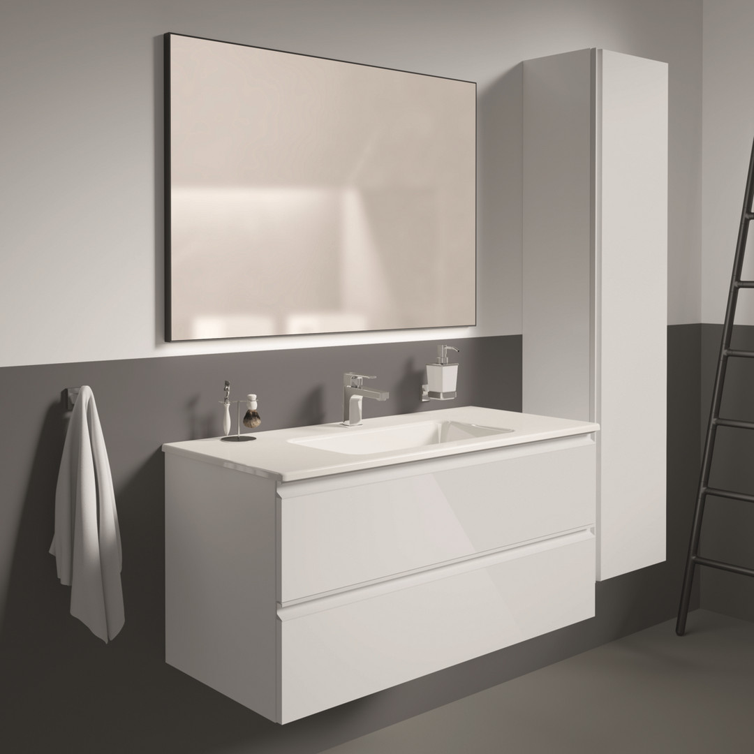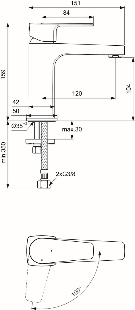 DN 15, Auslaufhöhe 104 mm, Luftsprudler (sichtbar), Metall-Zugstangen-Ablaufgarnitur G 1 1/4, flexible Anschlussschläuche G 3/8, Griff aus Metall mit Rot-/Blau-Markierung, Schnellmontagesystem, Kartusche Ø 28 mm, Kartusche mit keramischen Dichtscheiben, Kartuschenschwenkbereich 100°, Kartuschenübersetzung aus Kunststoff, Heißwassertemperaturbegrenzer, Norm DIN EN 248, Geräuschverhalten DIN 4109 Gruppe 1, Lebensdauer DIN EN 817, DIN EN 200