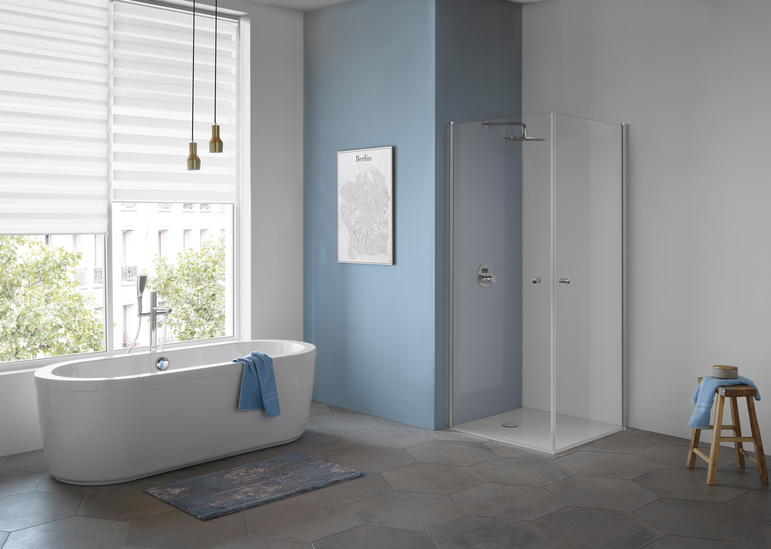 Eckduschenhälfte links und rechts verwendbar, teilgerahmt, 1-teilig mit einem Pendelelement, für Eckeinstieg, Profile aus Aluminium, mit Einscheibensicherheitsglas nach DIN EN 12150, optional mit reinigungsfreundlicher GlasPlus-Beschichtung, geeignet für Montage auf Duschwanne und auf dem Boden, für die Einbausituation in der Ecke, Breitenverstellung an einer Seite pro Schenkel, Wasserhemmleiste optional montierbar, An der Wand mit Wandprofil befestigt, Wandprofil mit stufenloser Breitenverstellung und zum Ausgleich von Schrägen, Breitenfixierschrauben mit Abdeckkappen, mit Hebe-/Senkmechanismus, Knaufgriff innen und außen, möglich sind Sondermaß und Schrägzuschnitt, Nicht alleinstehend montierbar, Montagezustand teilvormontiert, zu kombinieren mit TwiggyPlus EPW, TwiggyPlus EPWBO, bestehend aus: ein Pendelelement, ein Wandprofil, Wasserhemmleiste, Zubehör, Montageset, Produktdokumentation