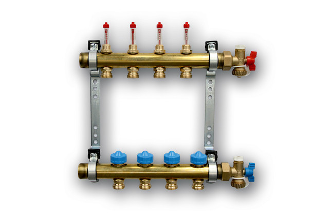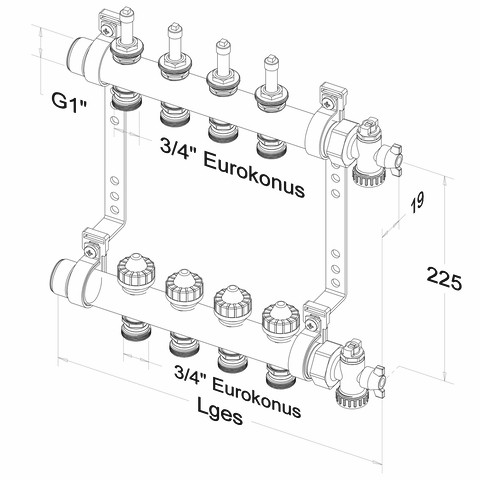 die Vorlauf- und Rücklaufrohre bestehen aus Messing und können von links oder rechts über die flachdichtenden 1" Außengewinde angeschlossen werden, Vorlauf: mit absperrbaren Durchflussanzeigen (Anzeigebereich: 0-4 l/min), Rücklauf: mit integrierten Thermostatventilen zum Einstellen der Durchflussmenge/Heizkreis, die Anschlüsse der Heizkreise erfolgen mit 3/4" Eurokonus, der Verteiler ist auf schallgedämmten Konsolen vormontiert, bestehend aus: Verteiler, Endstücke mit Absperrung zum Befüllen/Entleeren/Entlüften, Bezeichnungsschilder und Montageanleitung, für alle Systemrohre 11 bis 20 mm