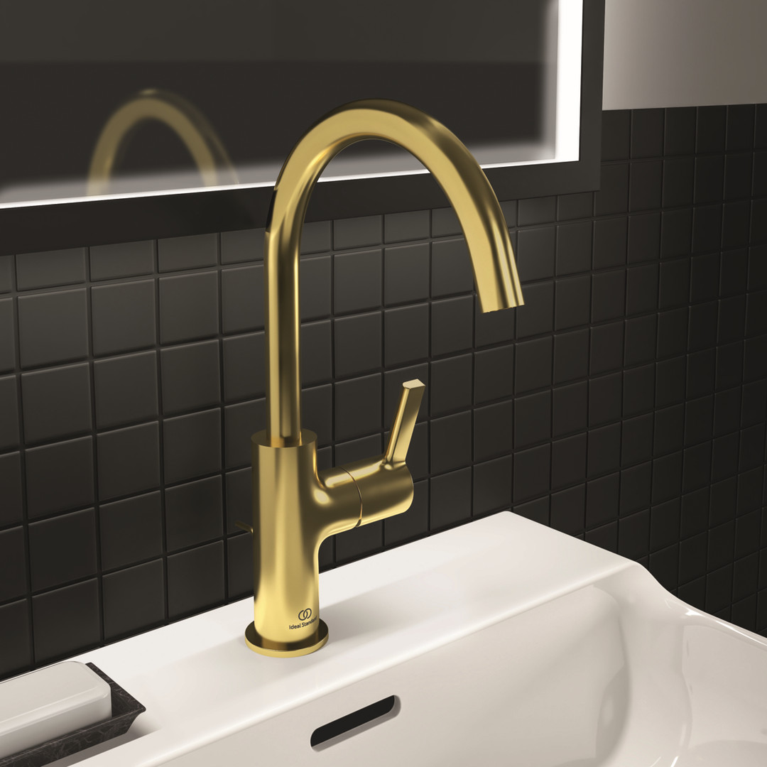 Ideal-Standard Waschtisch-Einhebelmischer Joy Ausladung 169mm, hoher Auslauf, schwenkbar, mit Metall-Ablaufgarnitur, brushed gold