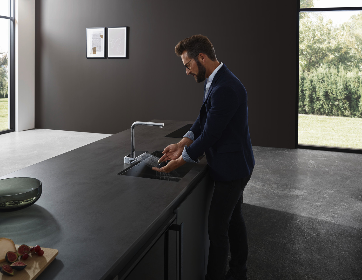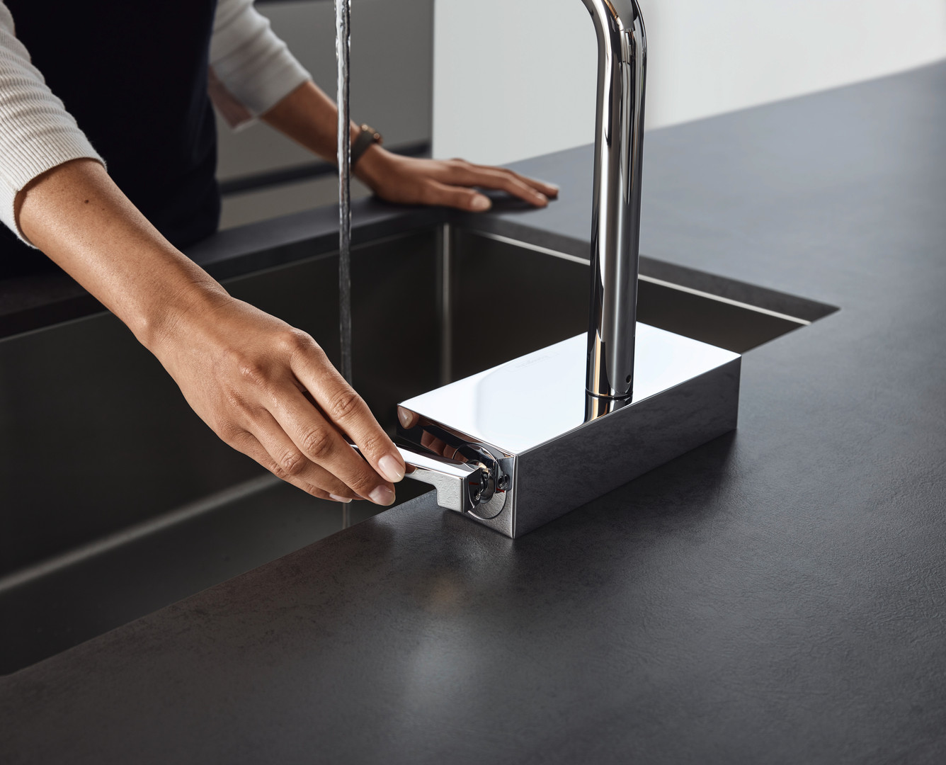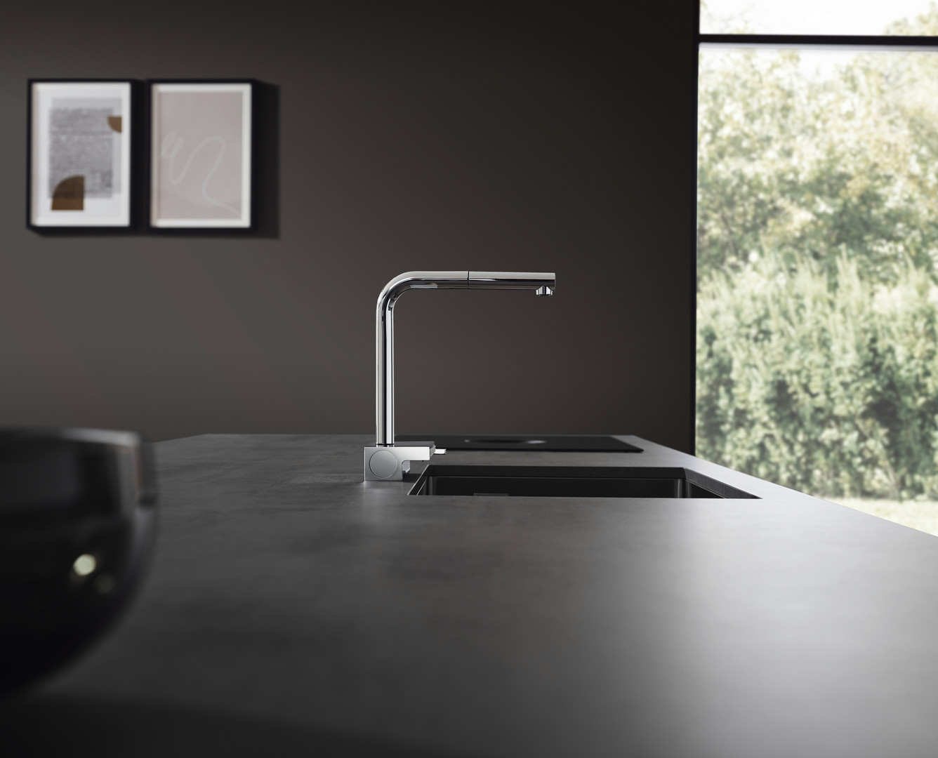 bestehend aus Einhebel-Küchenmischer, Schlauchbox, Multifunktionssieb, ComfortZone 250, L-Auslauf, Schwenkbereich einstellbar in 3 Stufen auf 60°, 110° oder 150°, Laminarstrahl, SatinFlow, Auszugslänge bis zu 760 mm, Umstellung von SatinFlow auf Ausziehbrause durch Tastendruck, MagFit magnetische Brausehalterung, Keramikmischsystem, max. Durchflussmenge bei 3 bar 6 l/min, Rückflussverhinderer integriert, nicht für Durchlauferhitzer geeignet, sBox für geschützte Schlauchführung im Unterschrank, Hahnlochbohrung mit 35 mm erforderlich, Hahnlochbohrung max. 50 mm von der Beckenrückwand, Quick Clean Antikalksystem