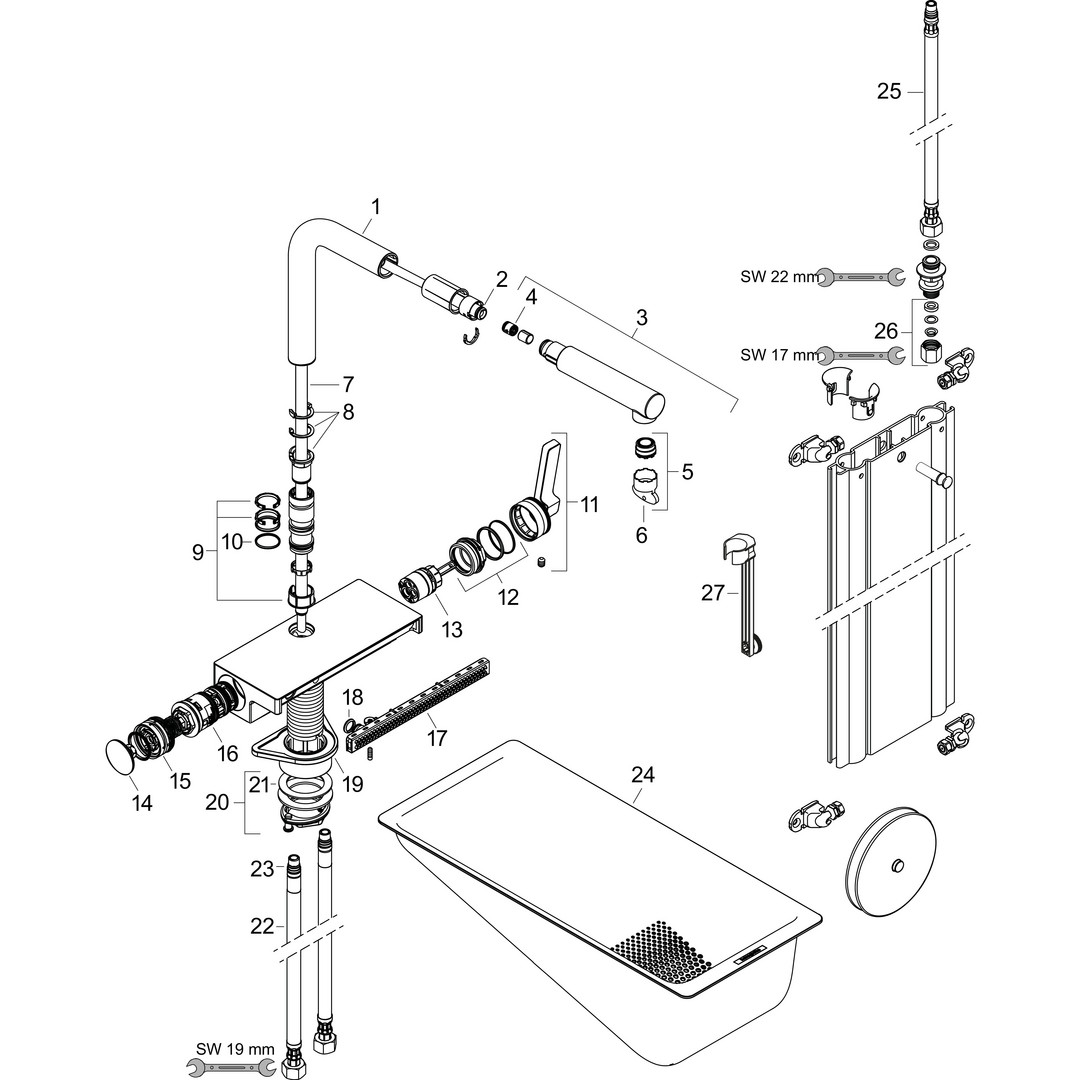 bestehend aus Einhebel-Küchenmischer, Schlauchbox, Multifunktionssieb, ComfortZone 250, L-Auslauf, Schwenkbereich einstellbar in 3 Stufen auf 60°, 110° oder 150°, Laminarstrahl, SatinFlow, Auszugslänge bis zu 760 mm, Umstellung von SatinFlow auf Ausziehbrause durch Tastendruck, MagFit magnetische Brausehalterung, Keramikmischsystem, max. Durchflussmenge bei 3 bar 6 l/min, Rückflussverhinderer integriert, nicht für Durchlauferhitzer geeignet, sBox für geschützte Schlauchführung im Unterschrank, Hahnlochbohrung mit 35 mm erforderlich, Hahnlochbohrung max. 50 mm von der Beckenrückwand, Quick Clean Antikalksystem