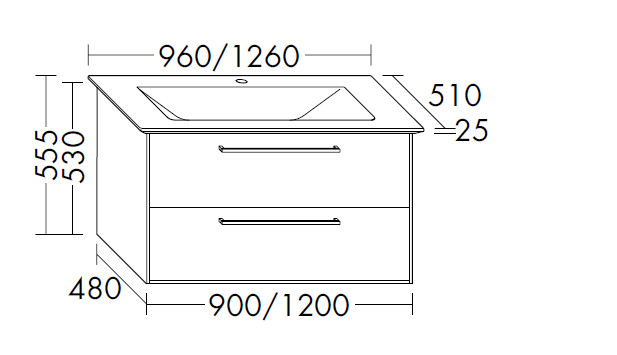 Mineralguss-Waschtisch: Muldentiefe: 120 mm, Beckenmaß 690 x 320 mm, Waschtischunterschrank: 1 Schublade oben mit Siphonausschnitt, 1 Auszug unten mit Raumsparsiphon