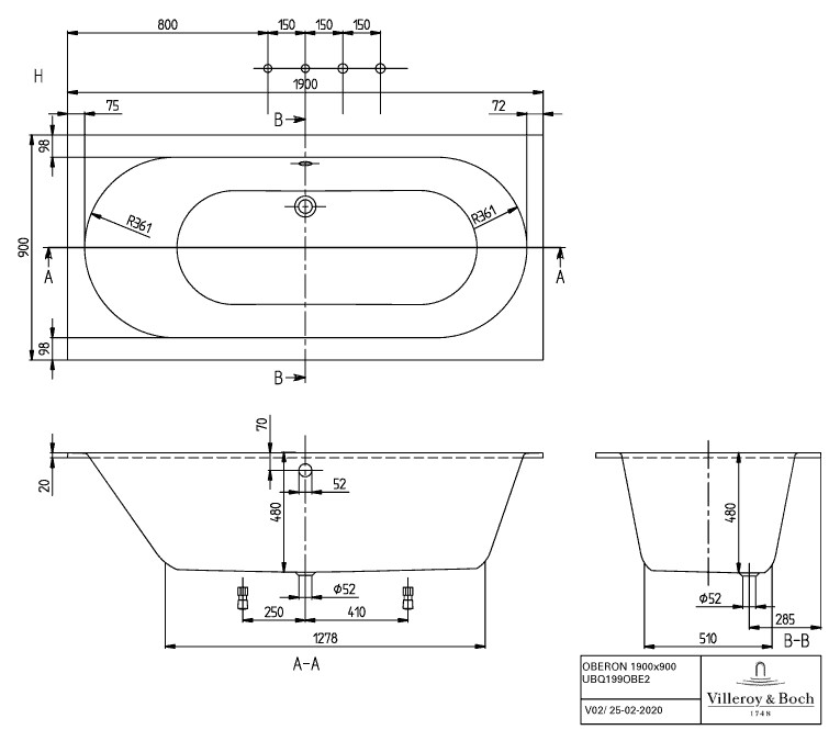 V&B Rechteck-Badewanne Oberon 190x90cm, Ablauf mittig, Quaryl, weiß W214487