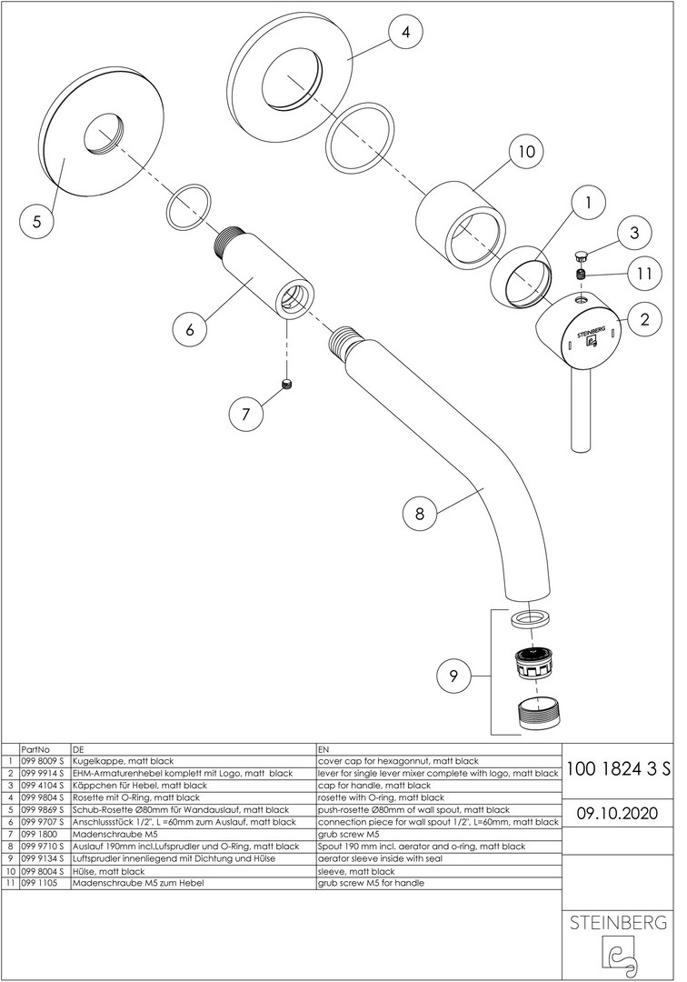 Steinberg Fertigmontageset Serie 100 Waschtisch-Einhebelmischer, Wandmontage, Ausladung 245 mm, matt black W323574