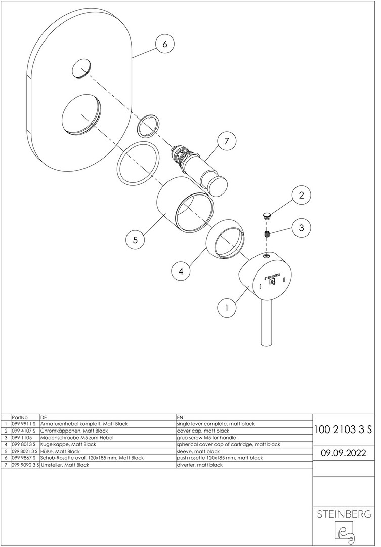 Steinberg Fertigmontageset Serie 100 für Wanne/Brause-Einhebelmischer, mit Umsteller, chrom, matt black