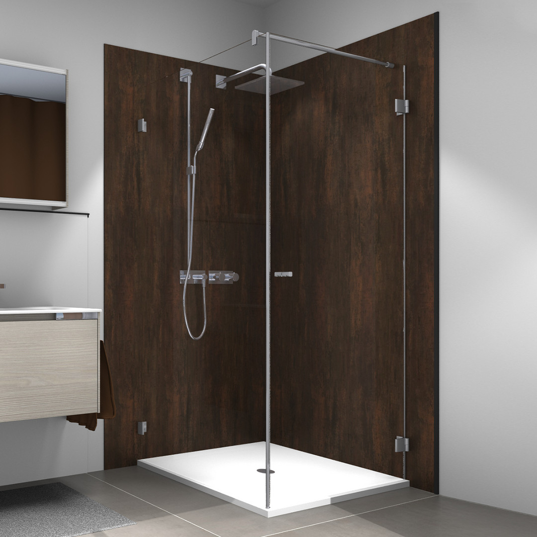 Glas 6 mm ESG transparent, Standardhöhe 2000 mm, Drehtüren öffnen nach außen, mit innen flächenbündigen Beschlägen, PALM.free, PALM. fix, PALM.lift, PALM.isi-clean, optional PALM.nano, PALM.care, punktuelle Wandbefestigung mittels Beschläge